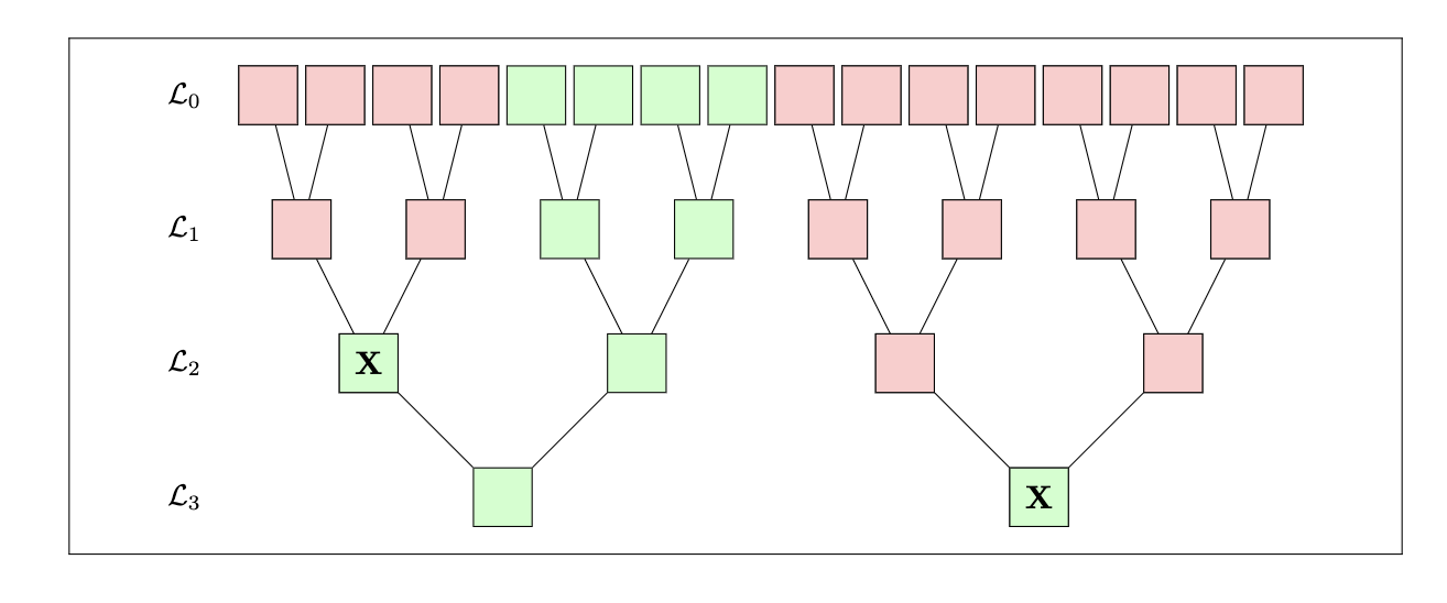 Once we’ve considered all groups of three, we can assign colors. All paths that start from a leaf in layer $0$ and terminate with an $\mathbf{X}$ are marked red (excluding the $\mathbf{X}$). We do this to reflect the fact that starting from such leaves, the verifier will inevitably arrive to the $\mathbf{X}$ and notice the inconsistency. All other nodes are colored green. An example is given below.