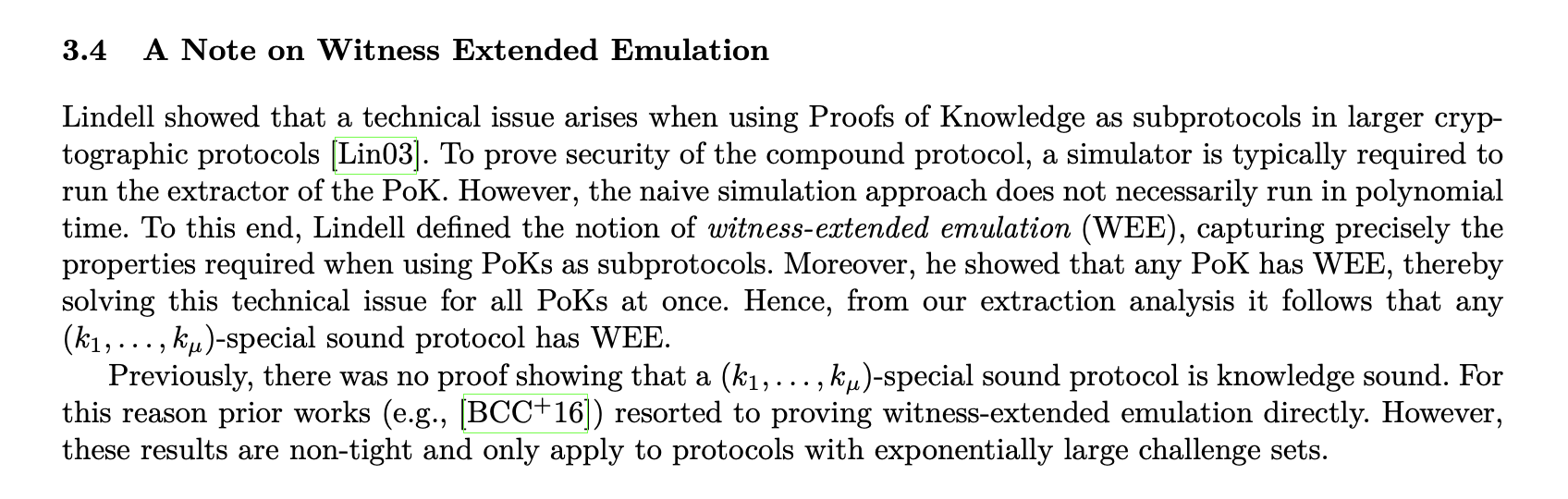 Witness-extended emulation is almost a tailor-made property for proving the security of such wider systems. It essentially requires that there exists an expected polynomial time emulator that “outputs the information required by the simulator to continue the simulation of the larger protocol” [Lin03].