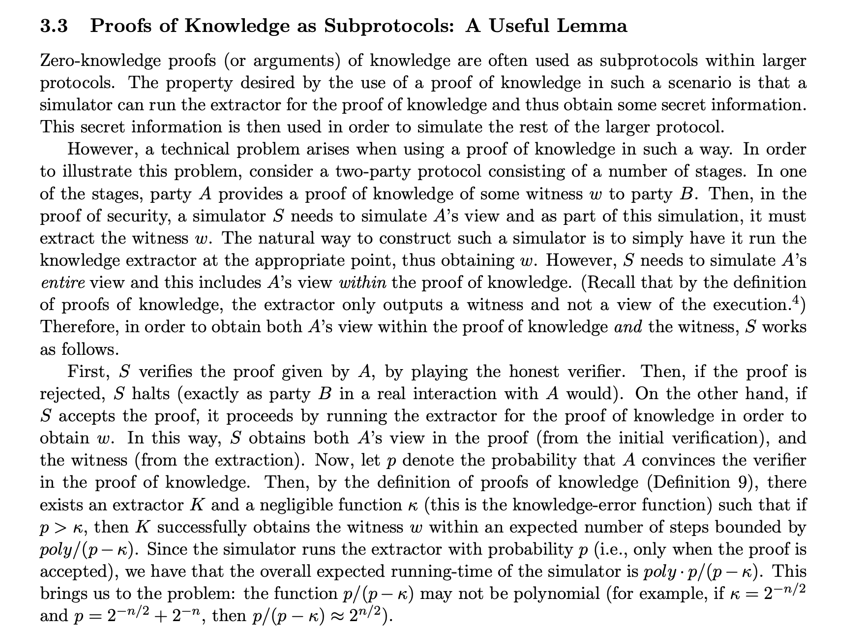 This technical difficulty was solved by Goldreich and Kahan in [20] and therefore there is no inherent problem here. However, their techniques are complex and thus applying them every time we wish to use a proof of knowledge as a subprotocol is cumbersome. Our goal here is therefore to present a general lemma that will enable the use of proofs of knowledge as subprotocols without requiring any complicated analysis. Rather, the analysis (indeed using the techniques of [20]) is needed only once in proving the lemma.